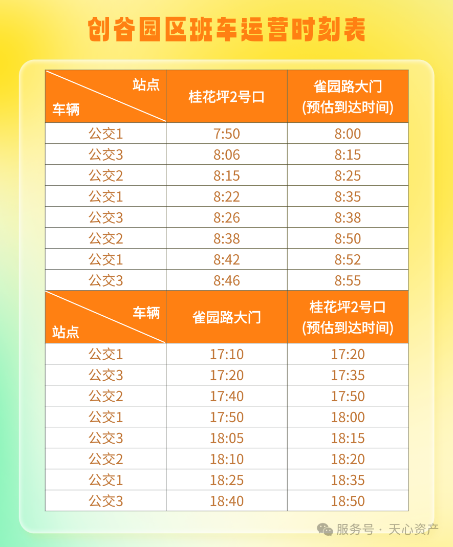 雀園路大門(mén)(南門(mén))→地鐵1號線(xiàn)[桂花坪]2號口(晚17:10-18:50)